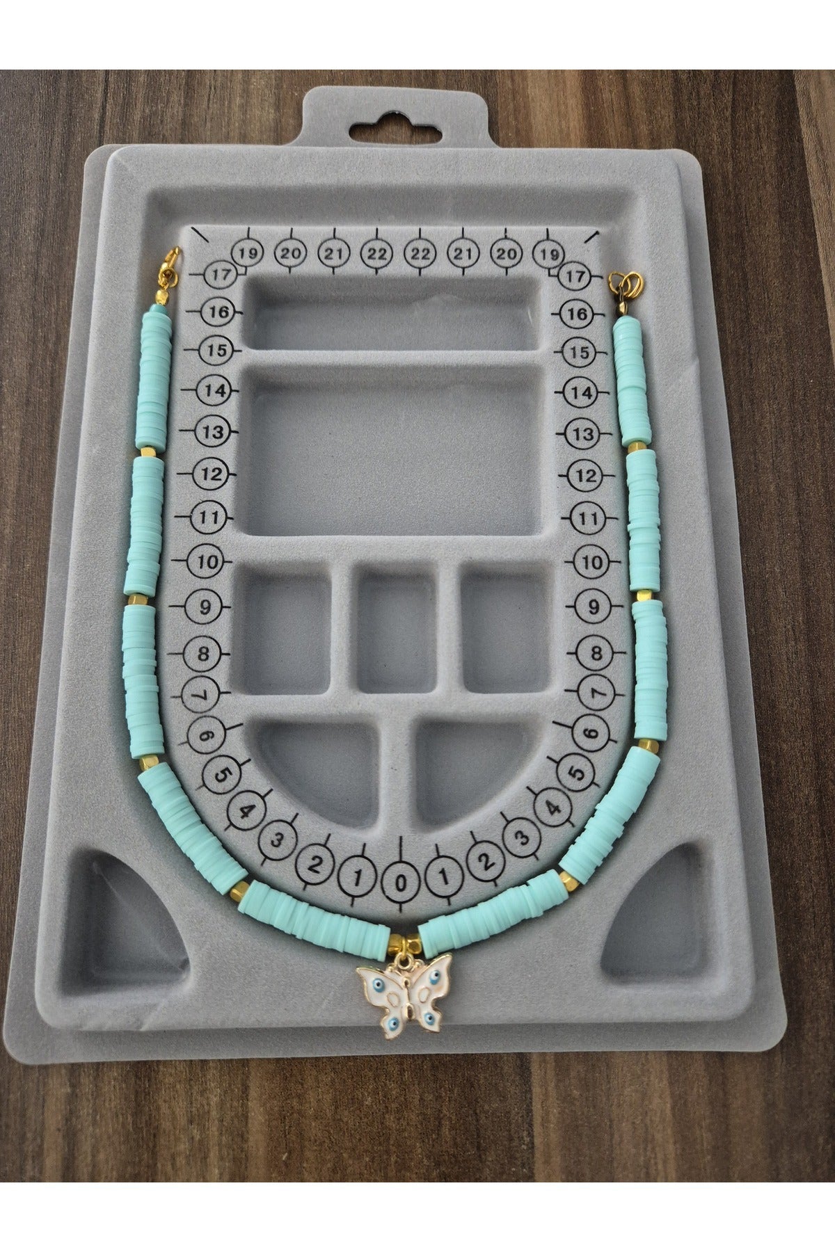 Fimo boncuklardan ve bileklik ipi kullanılarak yapılmış bir kolyedir.; Kolye ucu olarak beyaz bir kelebek vardır.; Her yaş grubunun kullanımına uygundur.; Bijuteri ürünüdür.;