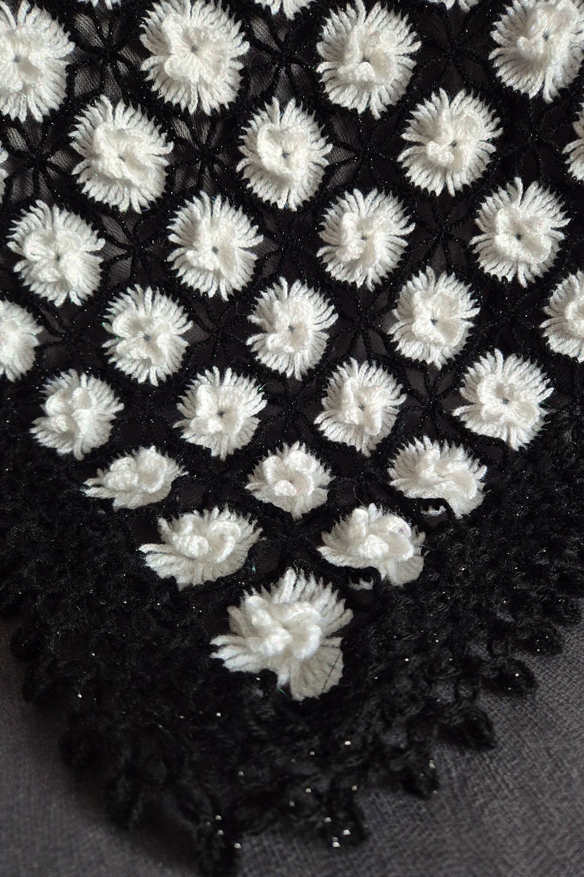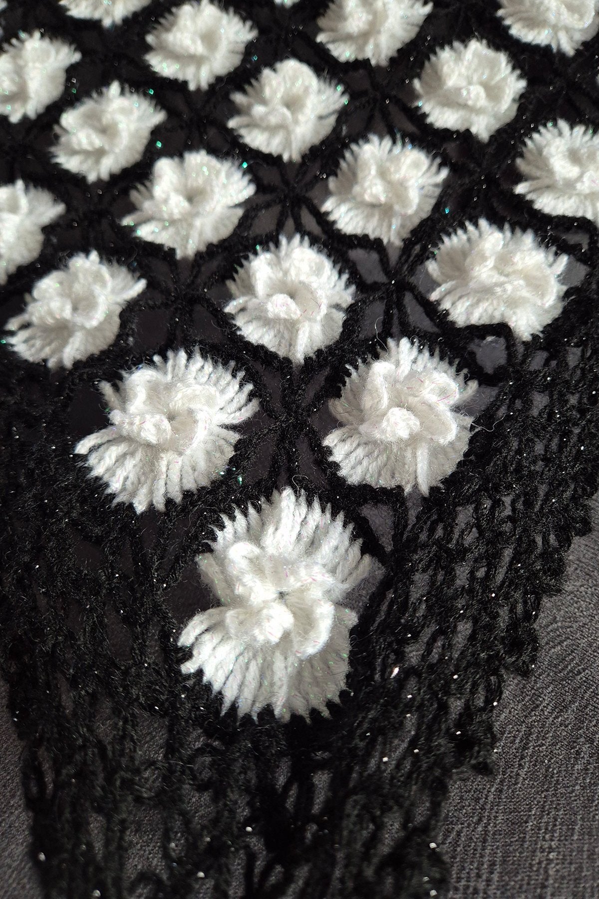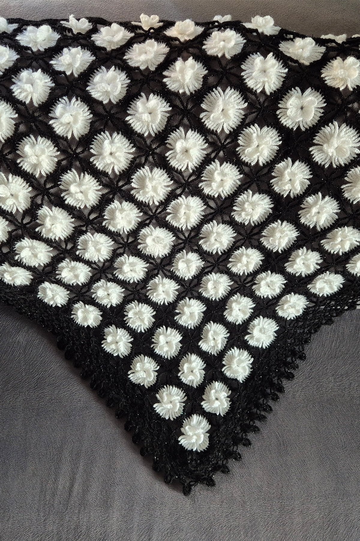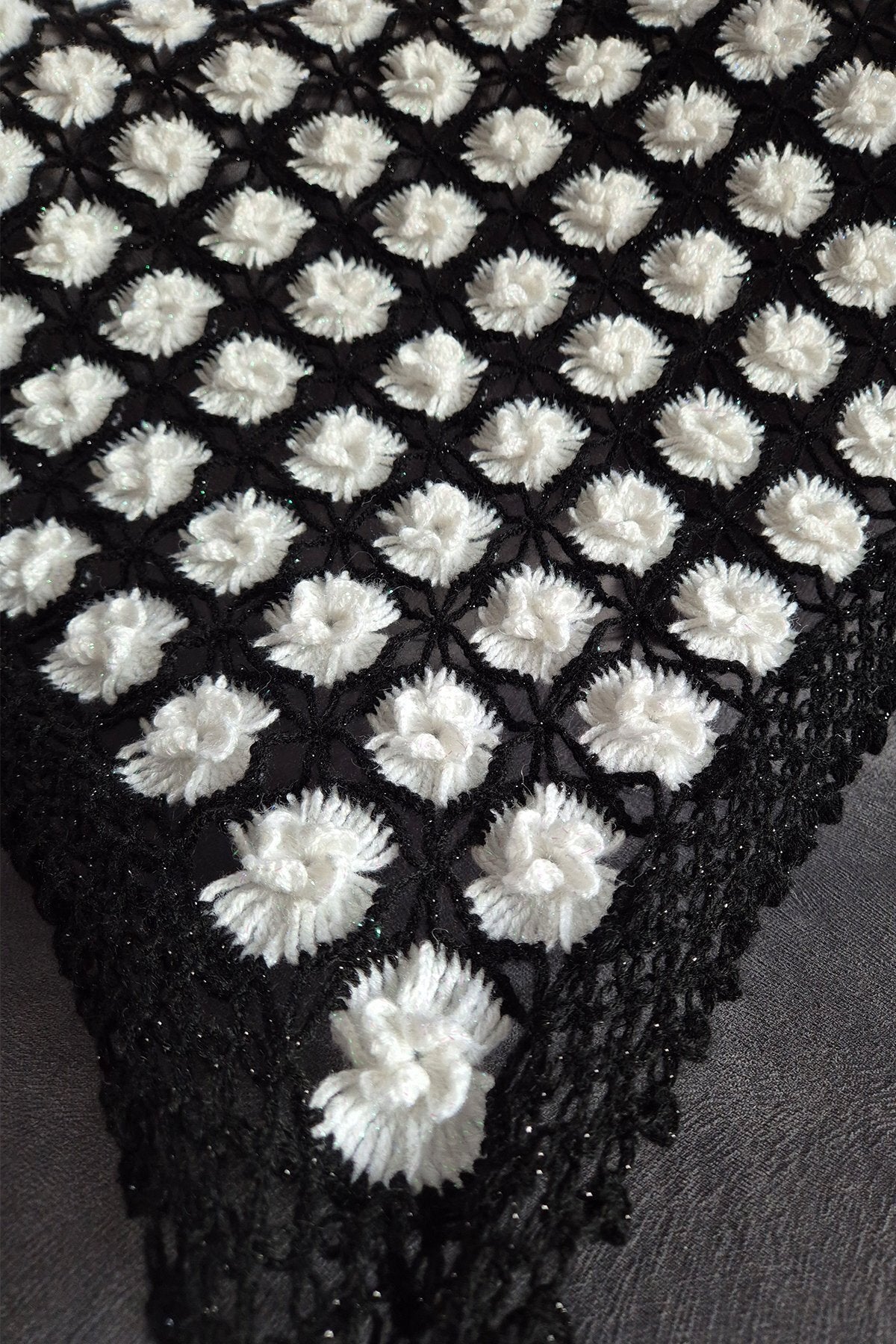 - Şal üçgen formunda örülmüştür.
