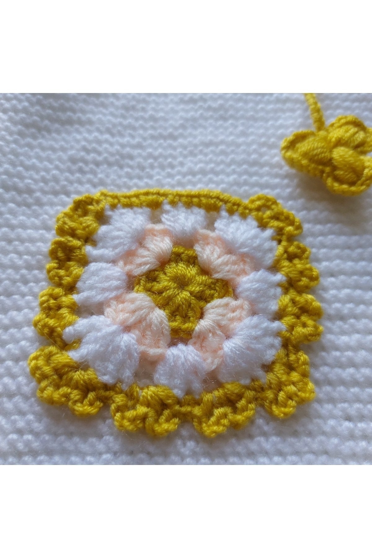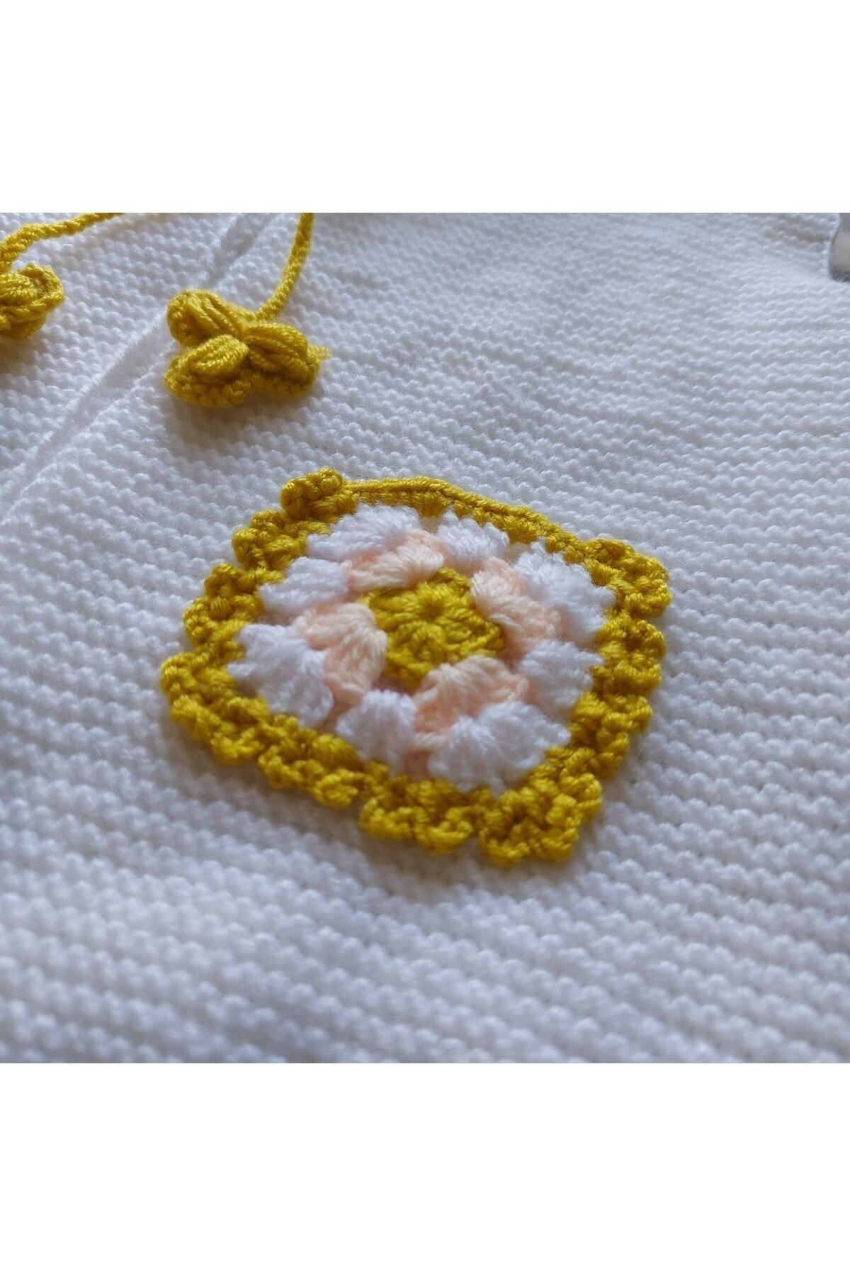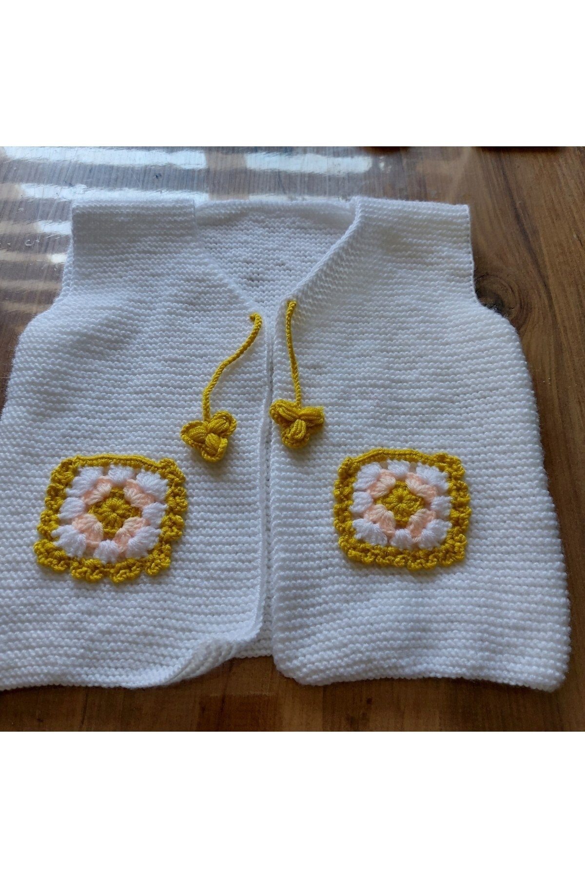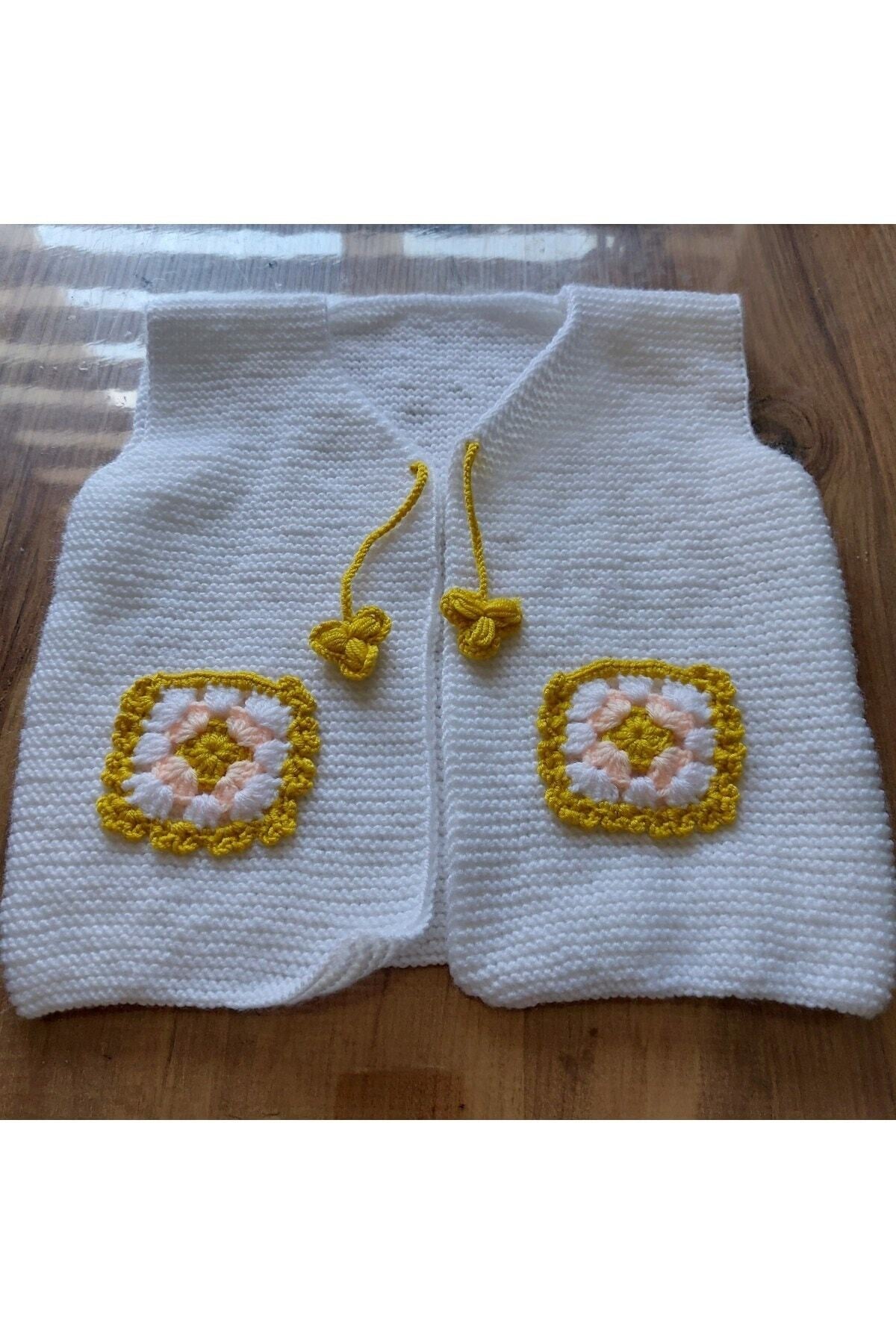 Beyaz Sarı Cepli El Örmesi Bebek Yeleği