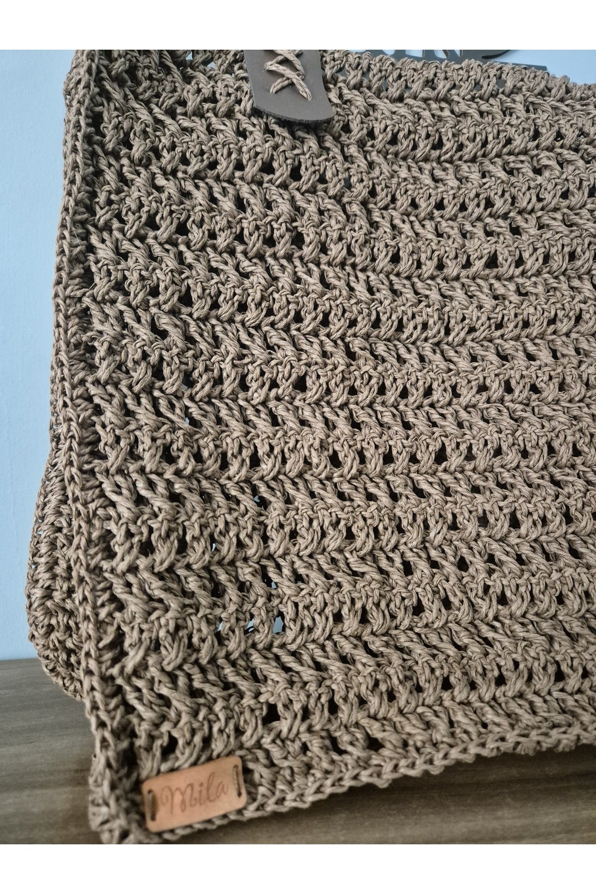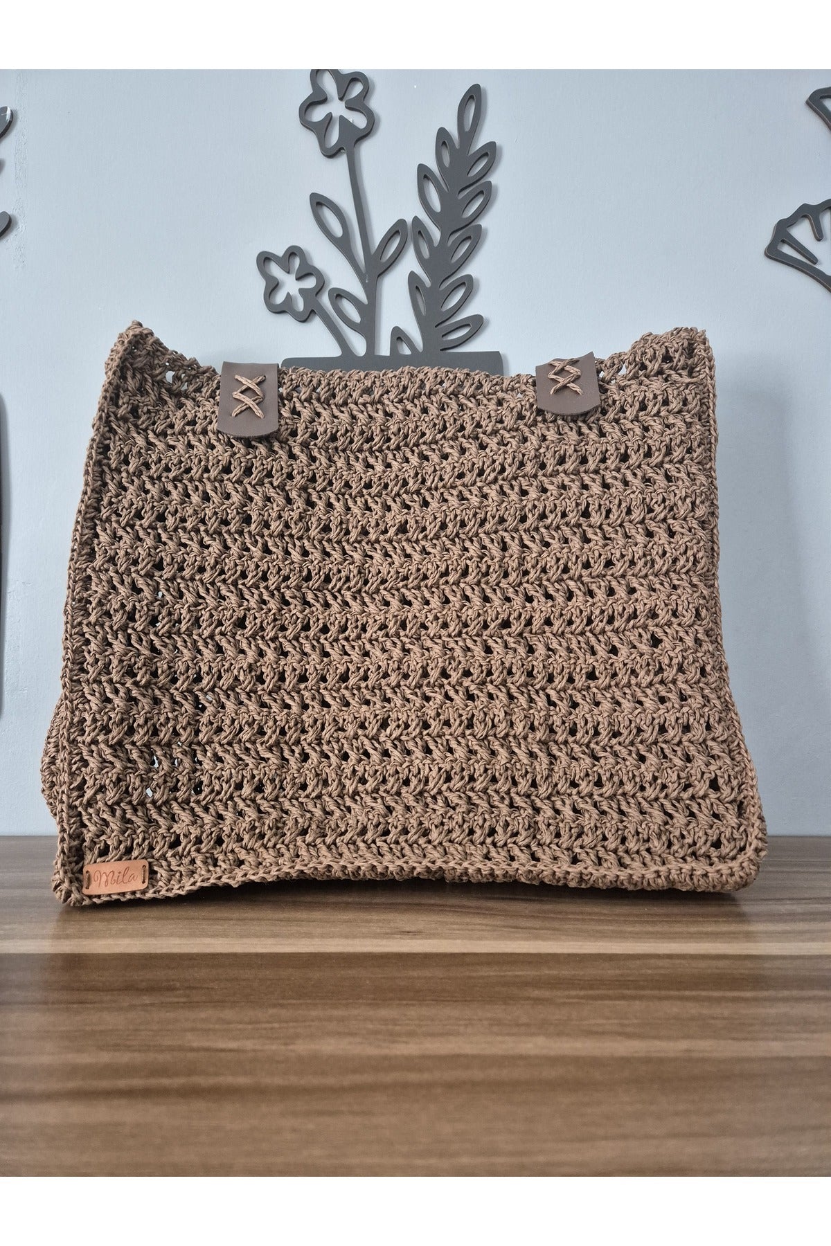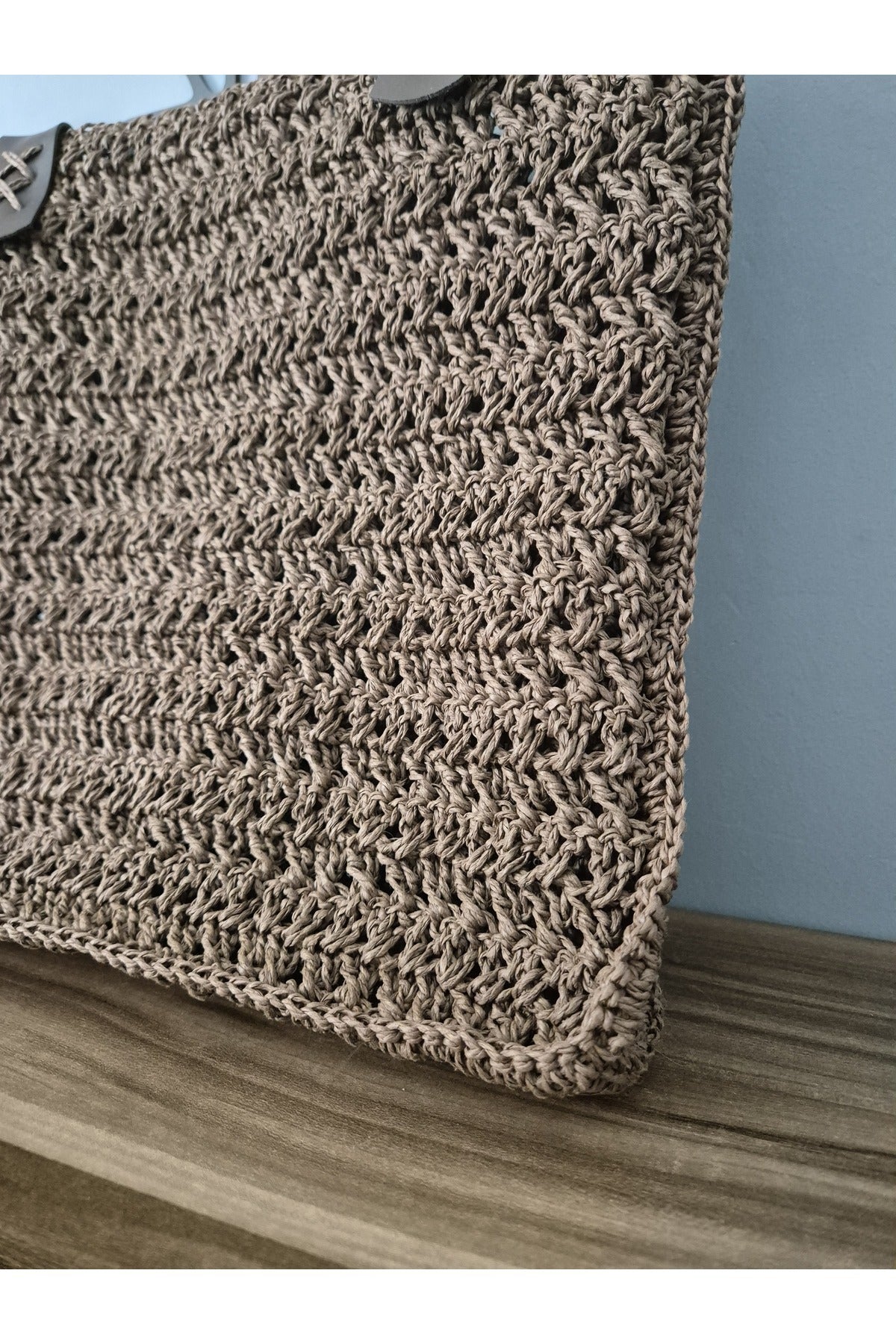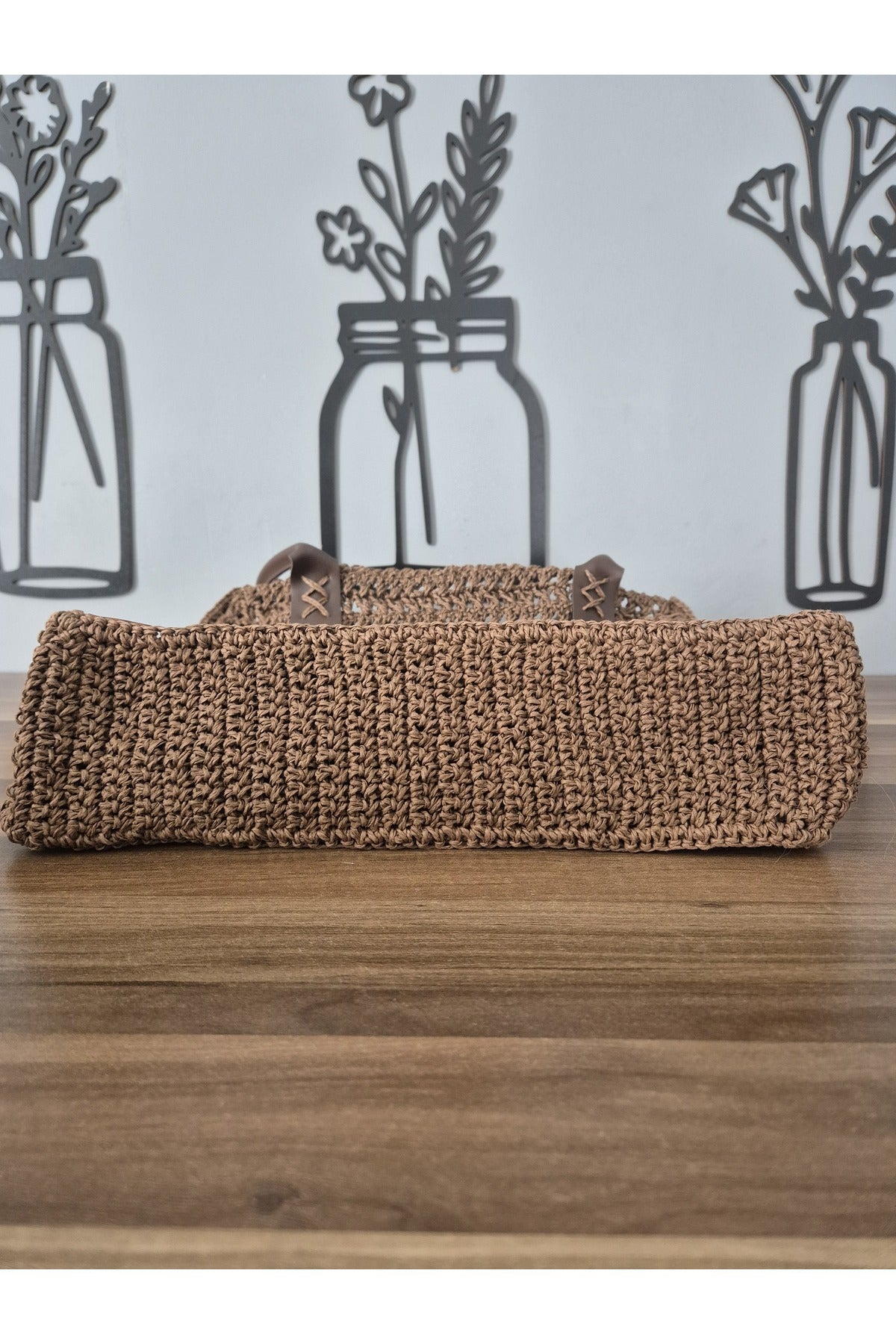 Kahverengi kağıt iple örülmüştür.; Ürünlerimiz tamamen el örmesidir.; Deri sap kullanılmıştır.; İçi astarlı değildir.; 30x35 cm ölçülerindedir.;